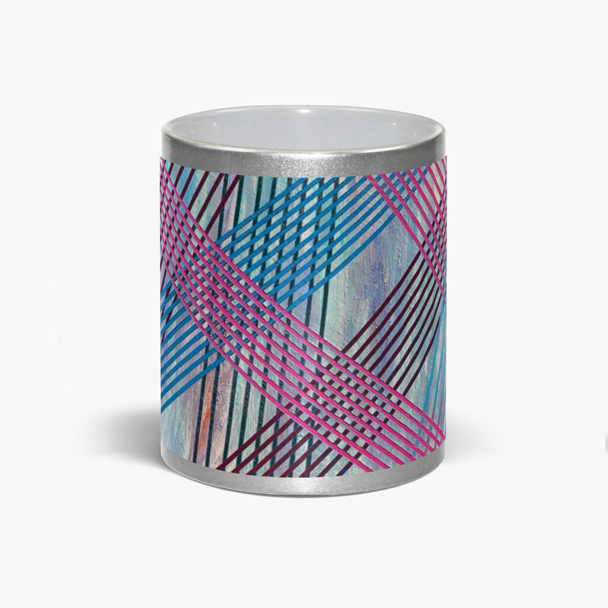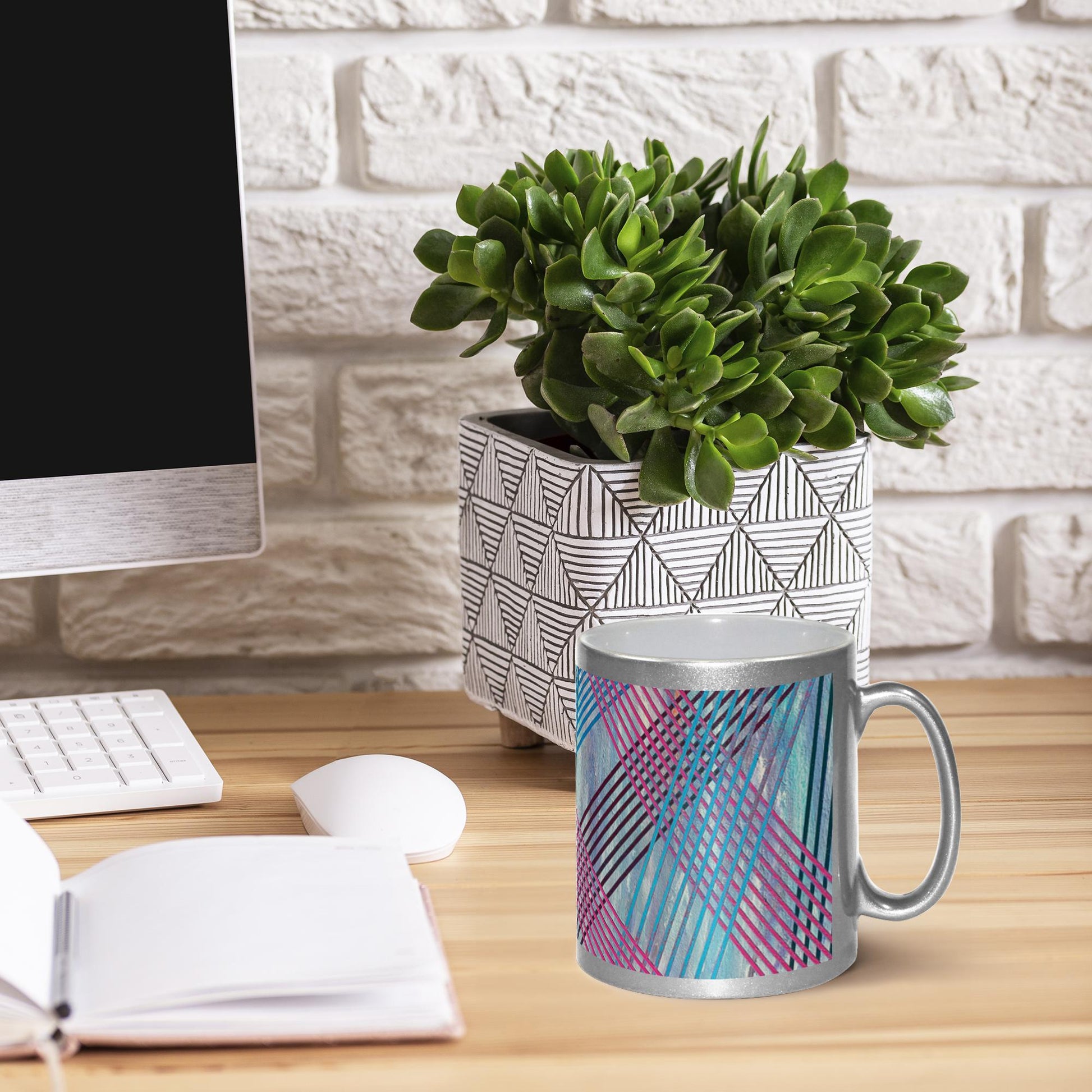 These 11 oz metallic mugs are a perfect way to start your day or close it! Crafted with a white ceramic base, these mugs are coated with your choice of three sparkling colors: pink, silver and gold with a wrap-around Jennifer S. Levine original.