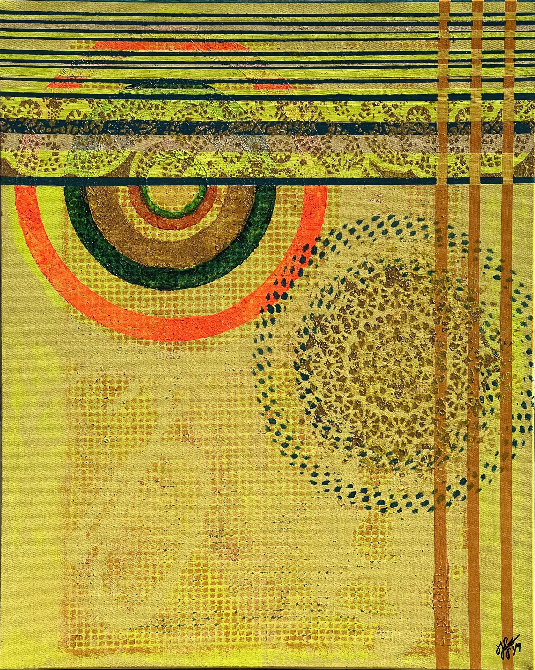 Mutable means liable or subject to change. This piece is about yellow. Of all the shades under the sun, it’s the one that loses its identity when mixed with another. A touch of red and it becomes a shade of orange, blue becomes a hue of green. Blue and red are bold colors. Yellow is vibrant but subtle in nature. It’s delicate and discerning, a generous color to lend itself to so many yet not be overbearing. This piece, though simple, was a complicated puzzle. How does one compose a yellow canvas yet still maintain an interesting theme? I sympathized with this piece. I begun questioning my own “yellow” qualities, my boundaries and circles. Being mutable and understanding with people, with situations, is kindness. But, at what point does that disposition lend itself to getting lost in the process? Where does one lose oneself gifting another with understanding before it causes hurt within yourself? When I was younger, the way I saw a piece as finished and separated myself from my work was to realize that each piece is a postcard from a certain space in my life. In that, I was easily able to move on because there was more to be done. MUTABLE is a perfect time capsule for where I’m at right now, as I venture forward on a new life and different future. Einstein said, “The definition of insanity is doing the same thing over and over again, but expecting different results.” In an insane world which can change in the blink of an eye, you only have yourself, your actions and words you leave behind at the end of the day. So, I’ll continue being true to my “yellowness” as an empathetic soul. But, I’m going to have to be aware of not giving people more than they would in return. It’s been a most valuable lesson, golden if you will.