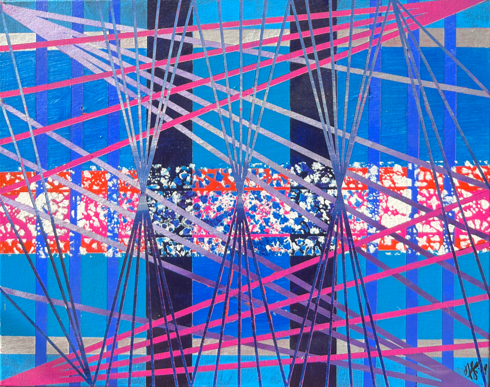 Syllogism is a seductive reasoning argument. It’s an Aristotelian concept of logic wherein it is best expressed in its typical form as “All A is C; all B is A; therefore all B is C.” The reason I was thinking about this concept and titled this piece as such is because I was playing with mirror images. From the alternating colors in the panels to the sloping lines across the piece and bars going down, the theme is balance. A perfect argument is not disruptive but balanced and logical. There are ways to disagree with someone or something and still find a common thread of harmony... even if it is simply to agree to disagree. I like this piece because to date, it’s the most thoughtful statement piece I’ve explored.