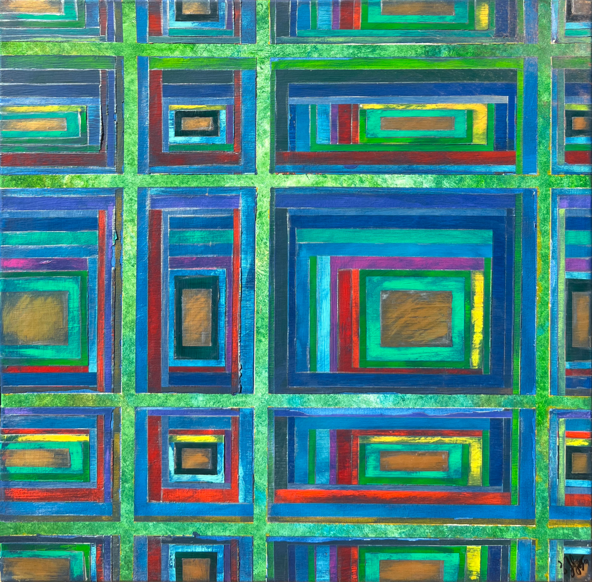 To transpose means to change the relative position or order, cause to change places, interchange. I don’t know how many layers I put in a piece. The paint just gets thicker and thicker. On the sides of the piece, you can feel the indentations and buildout where the canvas is lost and the paint has taken over its shape. What excites me about this process is the unveiling. Even though the entire piece has the same wash upon wash, each space and the way it reads takes on a whole different character. There’s an echo in the colors because they are the same but the sections have their own, unique personalities. When I first finished this piece I thought about doorways and different portals. When I looked further into it, I realized it wasn’t about possibilities but present states of being. So, to name it “Transpositions” seemed most appropriate to honor the process of its creation.